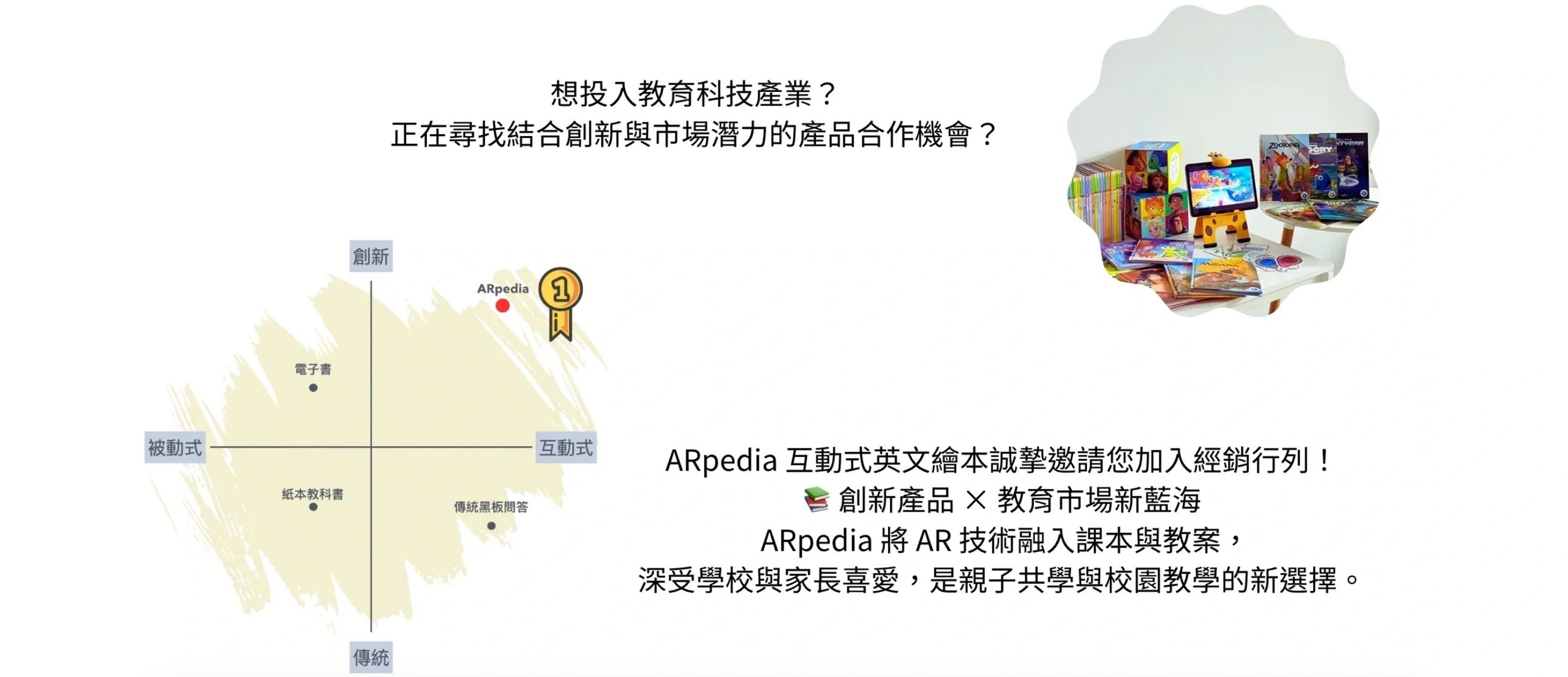 ARpedia 這套互動式英文繪本是由國際級 Woongjin Thinkbig 熊津教育集團所設計的,STUDIO A 從2023年起與 Woongjin Thinkbig 簽約成為 ARpedia 大中華地區獨家總代理。STUDIO A 為 Apple 的一級經銷商,主要銷售 Apple 相關產品,擁有線下實體據點、線上官網電商,亦有獨立的客服中心、維修中心與教學中心,讓在顧客購買後,提供顧客優質的售後服務與體驗。